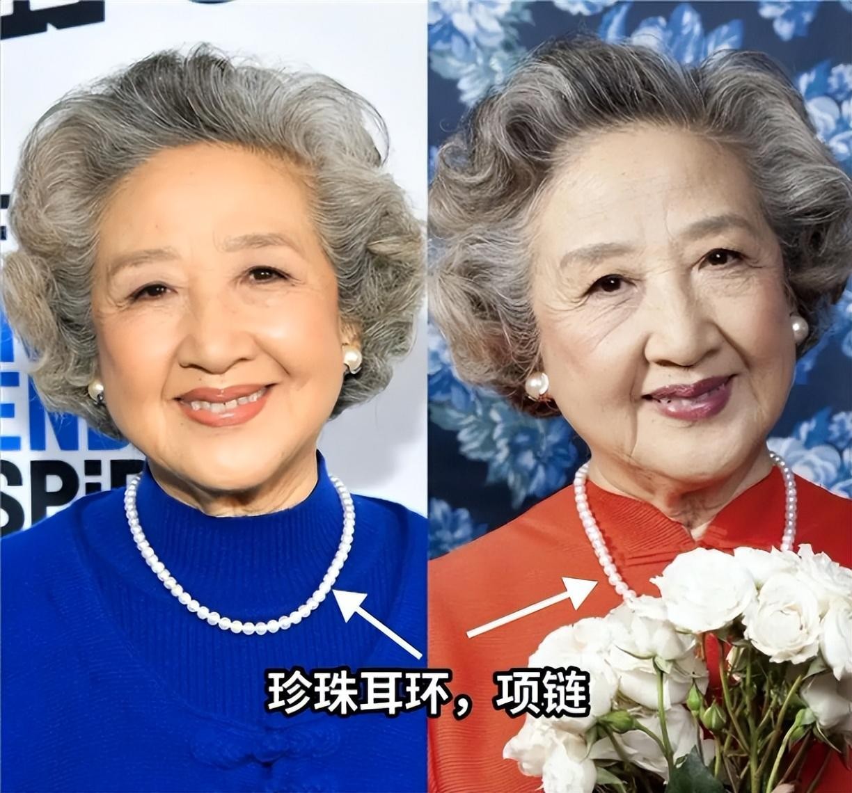 赵淑珍经常佩戴珍珠耳环或珍珠项链,这些简单而不简约的配饰为她的整体造型增添了几分柔和的光泽,使她看起来更加优雅和有气质。