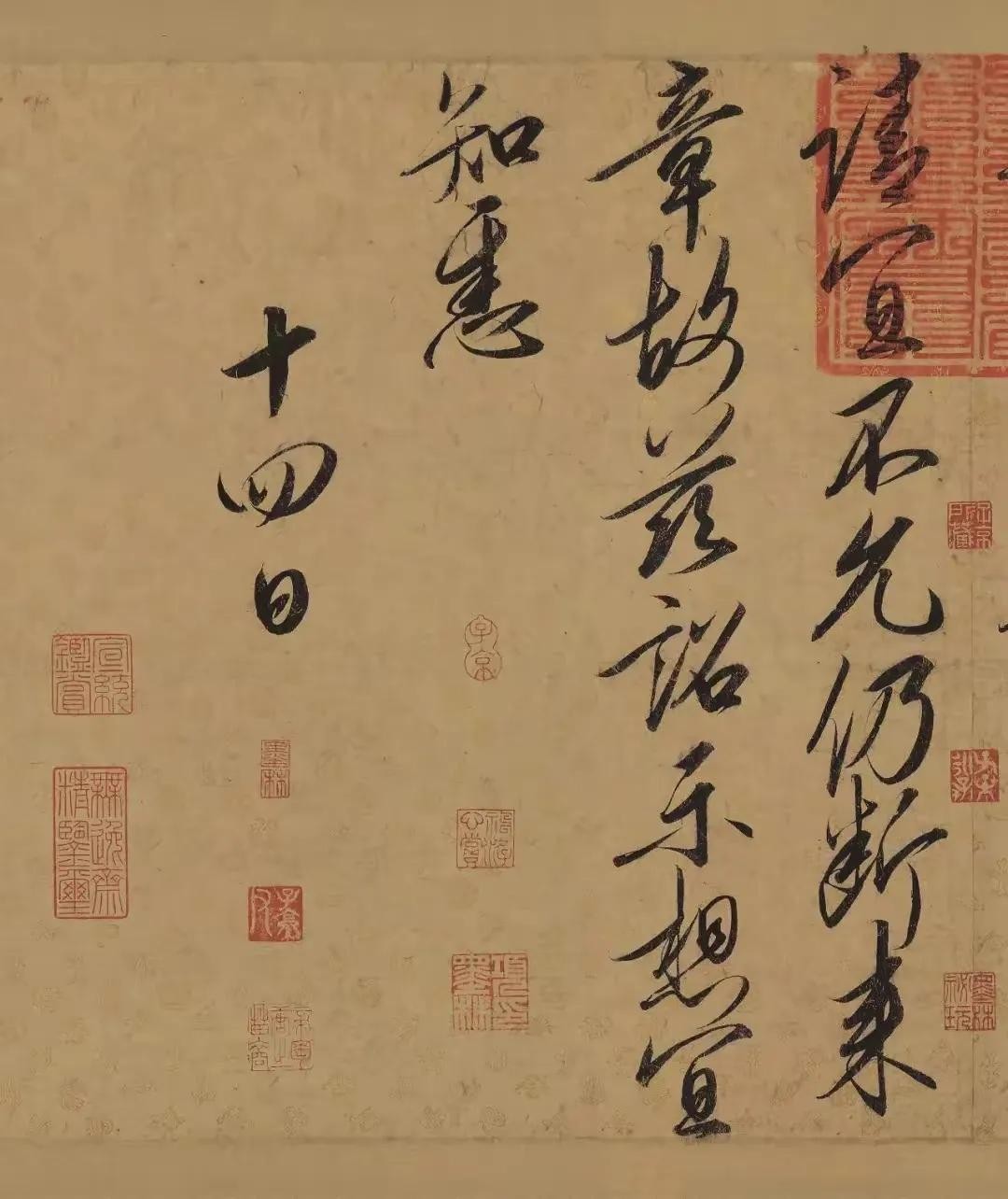 在书写过程中,宋徽宗注重作品的整体布局和节奏把握。他通过精心安排字与字之间的距离、行与行之间的间距以及整幅作品的布局和构图等要素,使得整个作品在视觉上呈现出一种错落有致、气韵生动的美感。同时,他还注重笔画的连贯性和书写的节奏感,通过巧妙的运笔和布局,使得笔画之间能够相互呼应、相互连接,形成一个有机的整体。这种章法风格不仅展现了宋徽宗对书法的整体把握和创作灵感,更体现了他对自然万物的深刻感悟和独特见解。