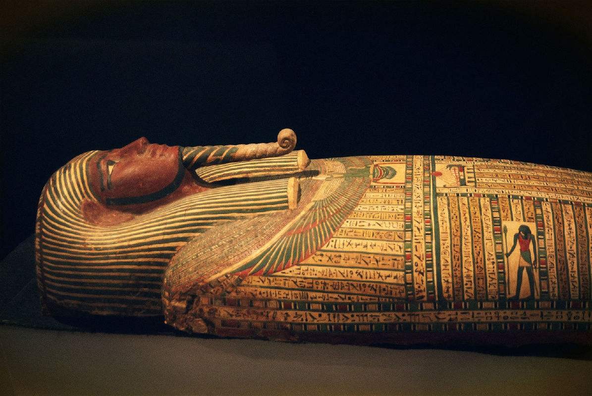 包扎木乃伊的步骤是这样的。第一步,干尸先用橘黄色的裹尸布包裹起来,然后从指(趾)头开始包扎。这需要用质量最好的亚麻布,有时还像图坦卡蒙和普苏塞恩涅斯国王一样戴上贵金属的指套。最后手和脚都被包裹起来。第二步,包扎头部。防腐师用长的亚麻布条,从右肩开始,绕过头部,交叉之后缠成“8”字形。有时还会用绷带勒住下巴,并在头顶打结。第三步,从手至肩将手臂缠绕起来。最后一步,从头到脚,将四肢与躯干全部绑在一起。在包扎的过程中,每缠上一层亚麻布,防腐师都在其上涂以熔化的树脂,使各层亚麻布粘在一起并增加其硬度。另外,死者身体凹陷的地方被用布块填满,以使木乃伊外表看起来比较充实。有的木乃伊因各种原因,肢体残缺,防腐师便用人工制作的假肢进行修补。这种假肢有手、脚、臂、腿,甚至生殖器。它们一般用亚麻布缠裹而成,并用树脂使其变硬,看起来惟妙惟肖。