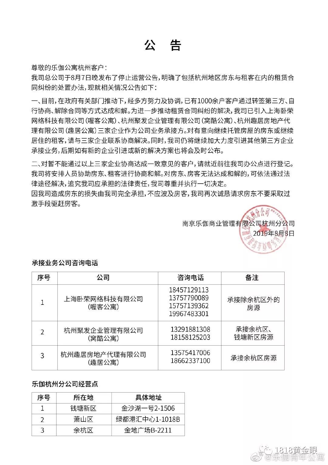 最近,乐伽公寓通过官方微博发布公告,讲解了关于杭州乐伽客户的处理方案,说是引进了三家公司承接杭州业务。最近,其中一家承接余杭临平区域业务的中介公司主动联系上我们,介绍了工作进展。