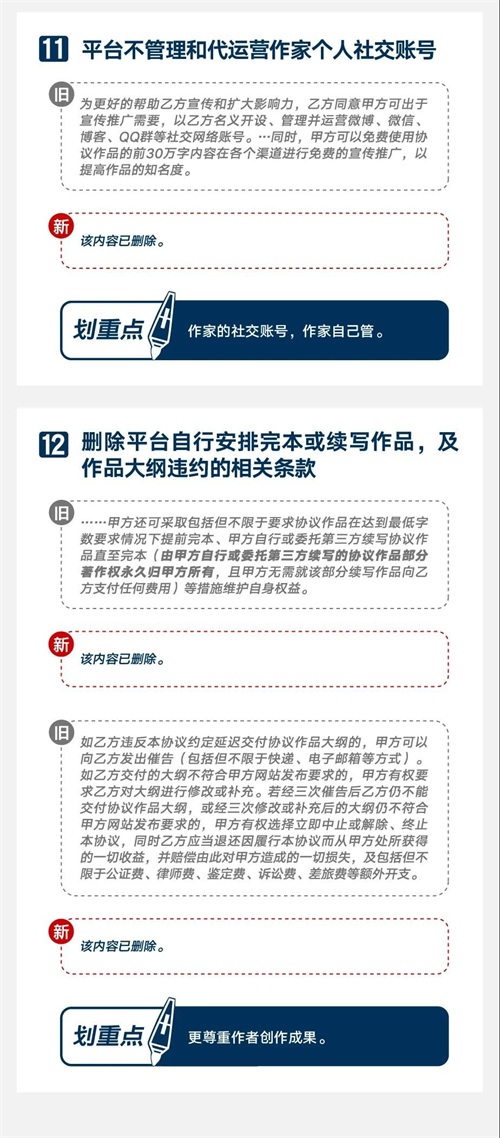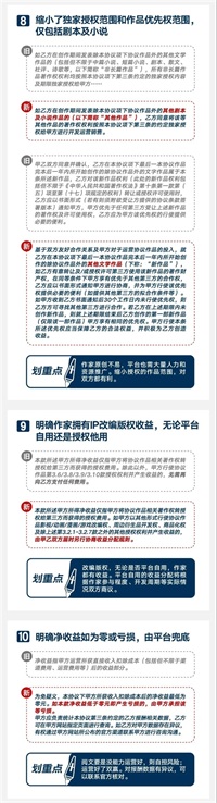 同时,也对旧合同中引起较大争议的十余个条款进行了大刀阔斧的调整。例如,以条款的方式明确了免费/付费阅读模式必须征得作家同意、强调著作人身权属作者、明确平台与作家属合作关系并提供多种福利权益、明确无论平台自用还是授权他用作家均拥有IP改编版权收益等。