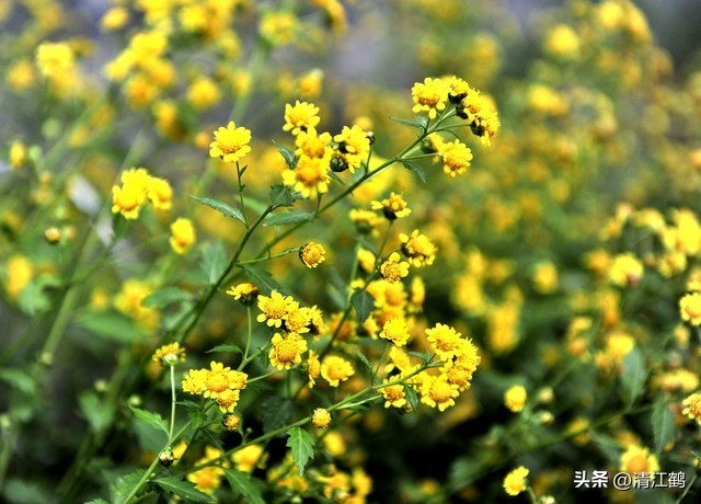 叶卵圆形或长卵圆形互生,叶缘有锯齿,叶表深绿色,叶脉上有稀疏的细毛,叶柄绿白色。头状花序生于枝端,花黄色果细小灰褐色,花期10月一11月。遗传了很多菊科家族中的优点,适应性广。