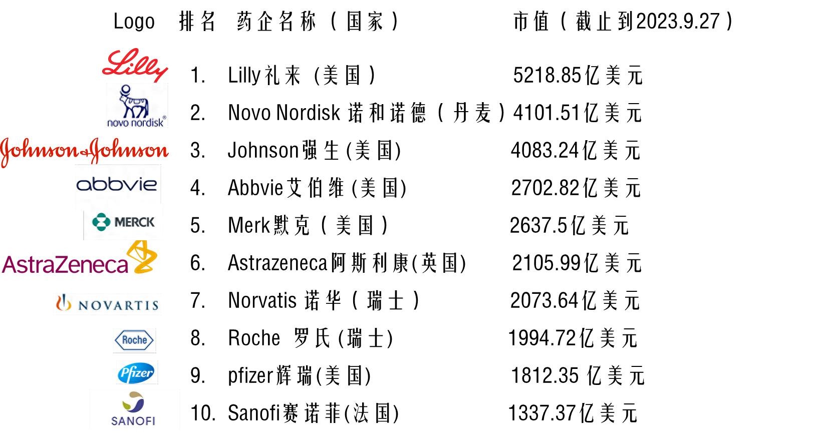 要了解新药研发,首先要了解一下世界知名药企。我们先根据市值给全球药企排个名,下图是截止到2023年9月27日的市值前十的排名。这个次序每年都会改变,但这10家药企的排名都比较稳定,无论怎么变,基本上都能保持在前10名以内。左边显示的是这些公司的logo。