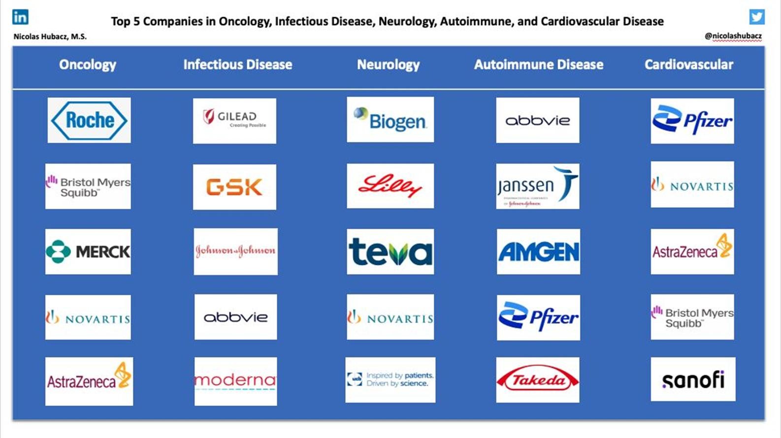 一半,有5家,欧洲占了另一半,英国、法国、丹麦各一家,瑞士这个小国有2家,罗氏和诺华,让人不得不佩服。下面这个图展示的是这些公司最擅长的研发领域。