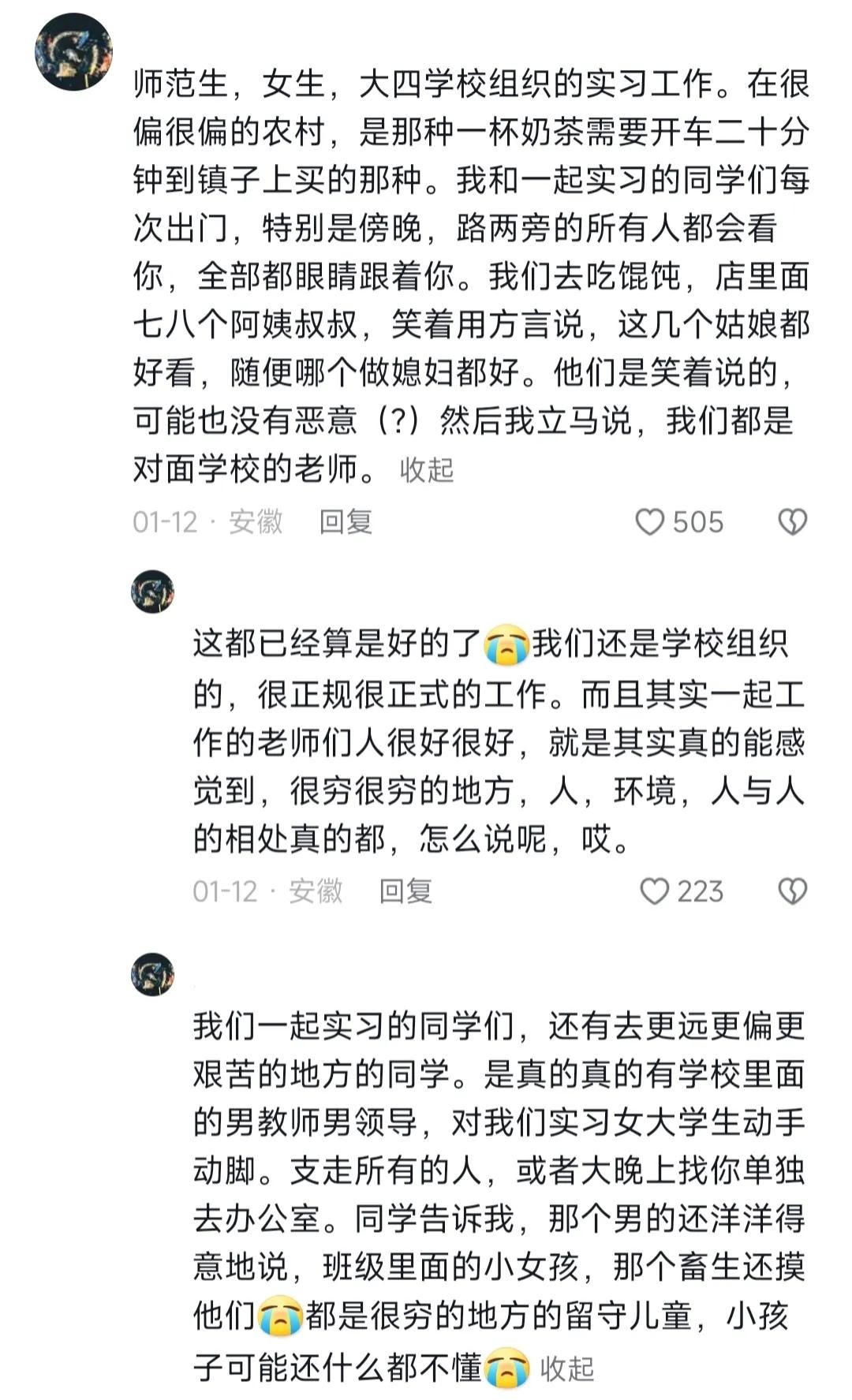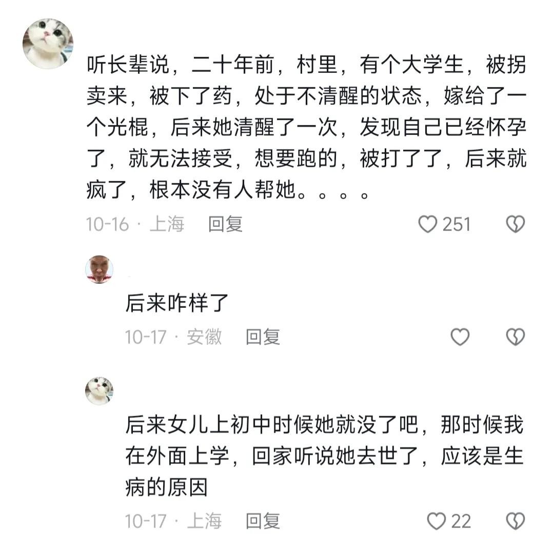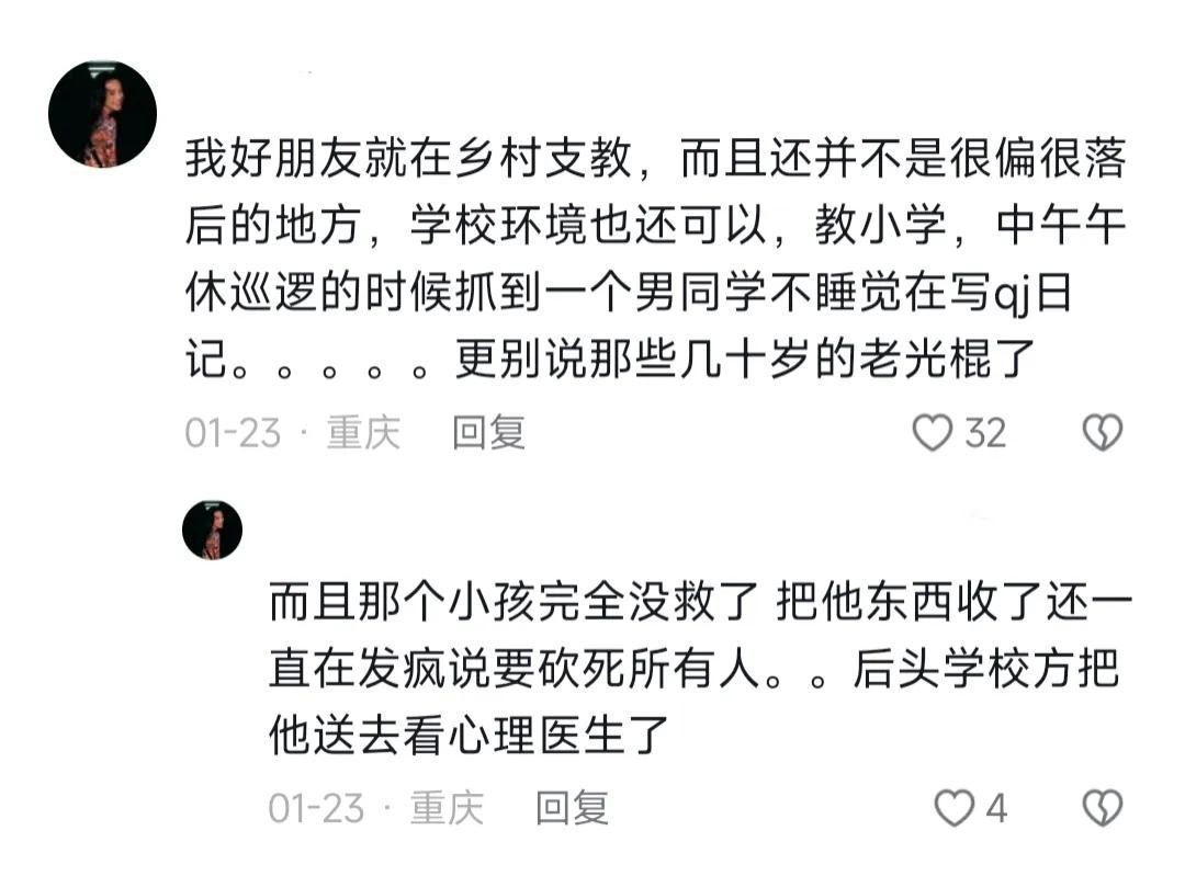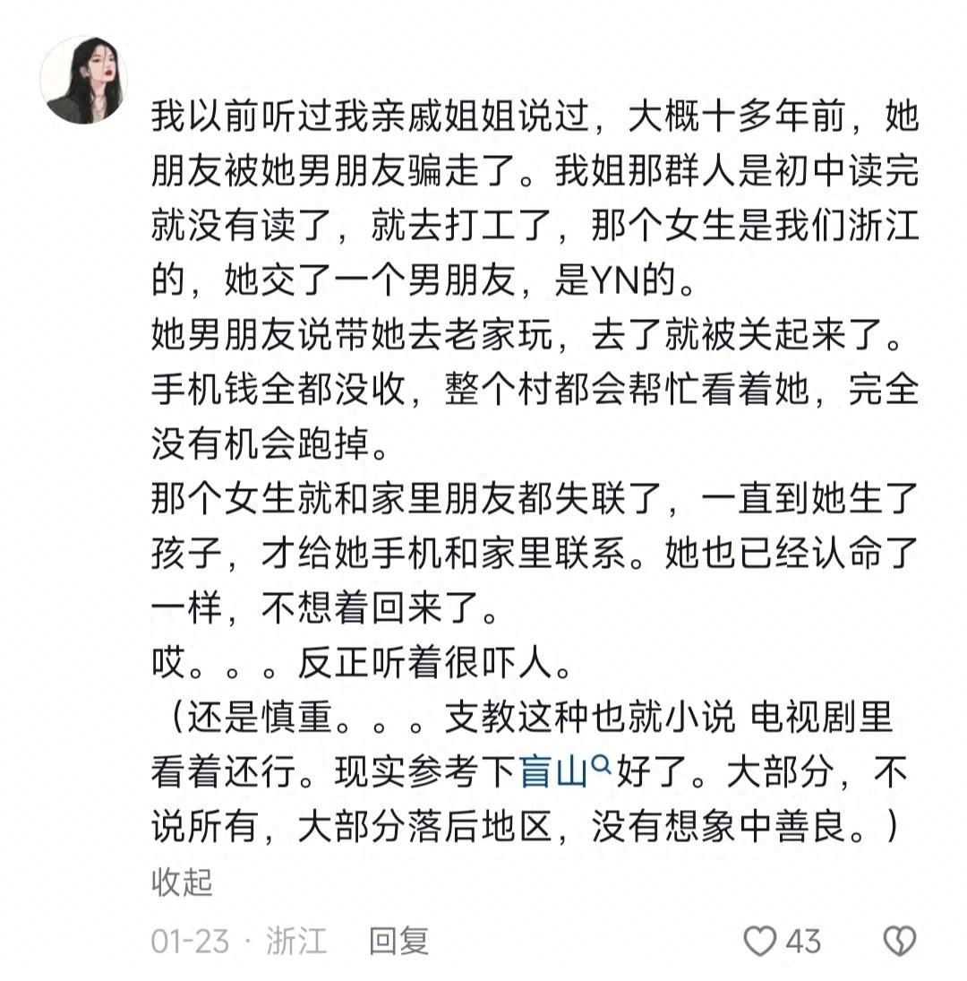 而且这些地方的人往往一点法律常识都没有,他们不觉得把支教女生强迫嫁给村里老光棍有什么问题,就算有人觉得有问题对于他们来说一个女生的人生被毁掉也远远没有被村子里其他人一起孤立来的后果严重,而且可能还觉得如果自己站出来才是害了同村人无子无后,很可怕。