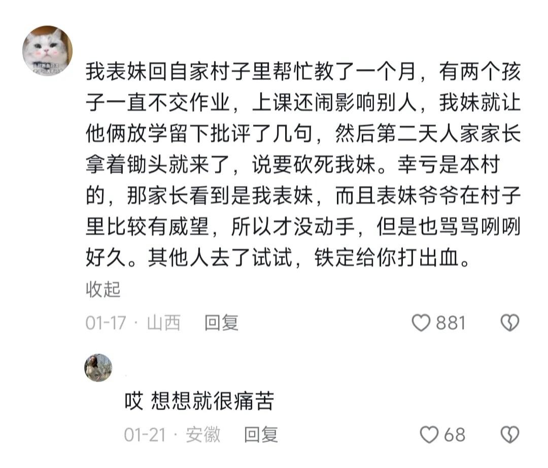 有的村民直接想把支教的女生绑走嫁给村里的光棍,同行的男教师也打不过他们,警察来了他们都不怕。
