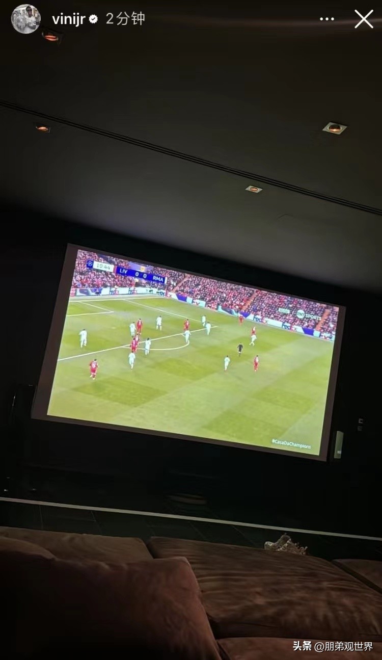 维尼修斯心系球队!在家养伤也不忘打开电视观看皇马VS利物浦的欧冠大战!