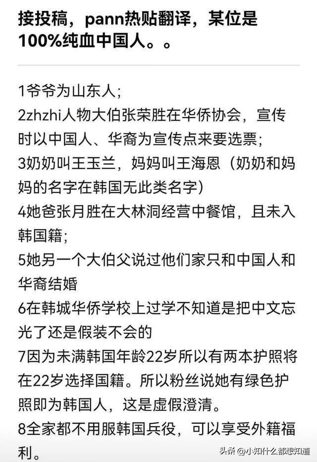 诸多光环之下也有暗流涌动,去年在韩国论坛上对张元英国籍提出了争议,根据贴主扒出的资料来看,张元英是百分百的中国人,祖籍是中国山东,有理有据,张元英在综艺里声称从没吃过泡菜,甚至有张元英的同学贴出她在汉族学校的照片和张元英家族的历史,这些对于中国人来说可是吃了个大瓜,居然有“中国人”在排外的韩国中c位出道,对于韩国人来说也是当头一棒,要知道张元英的c位可是为了不让第二名的日本人小樱花c位出道。
