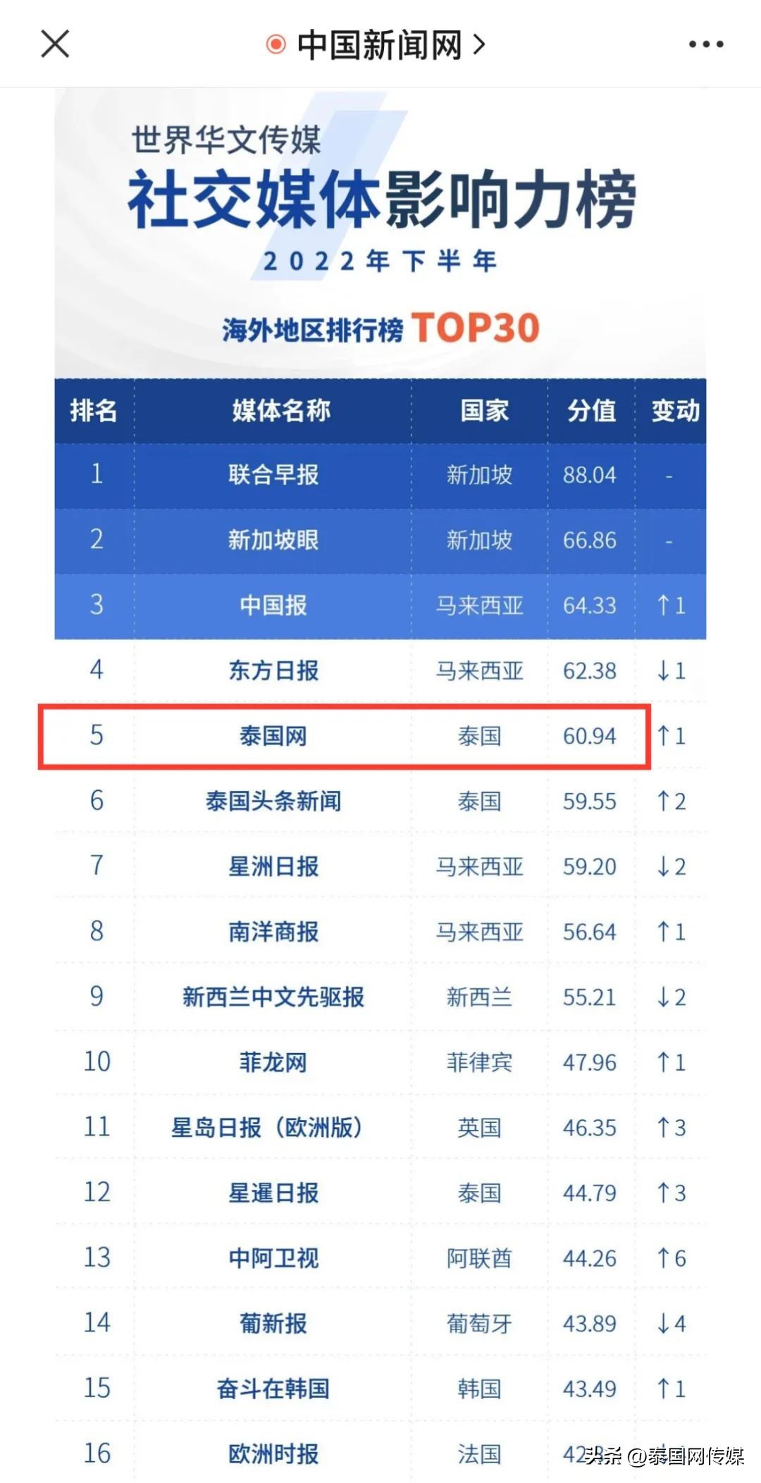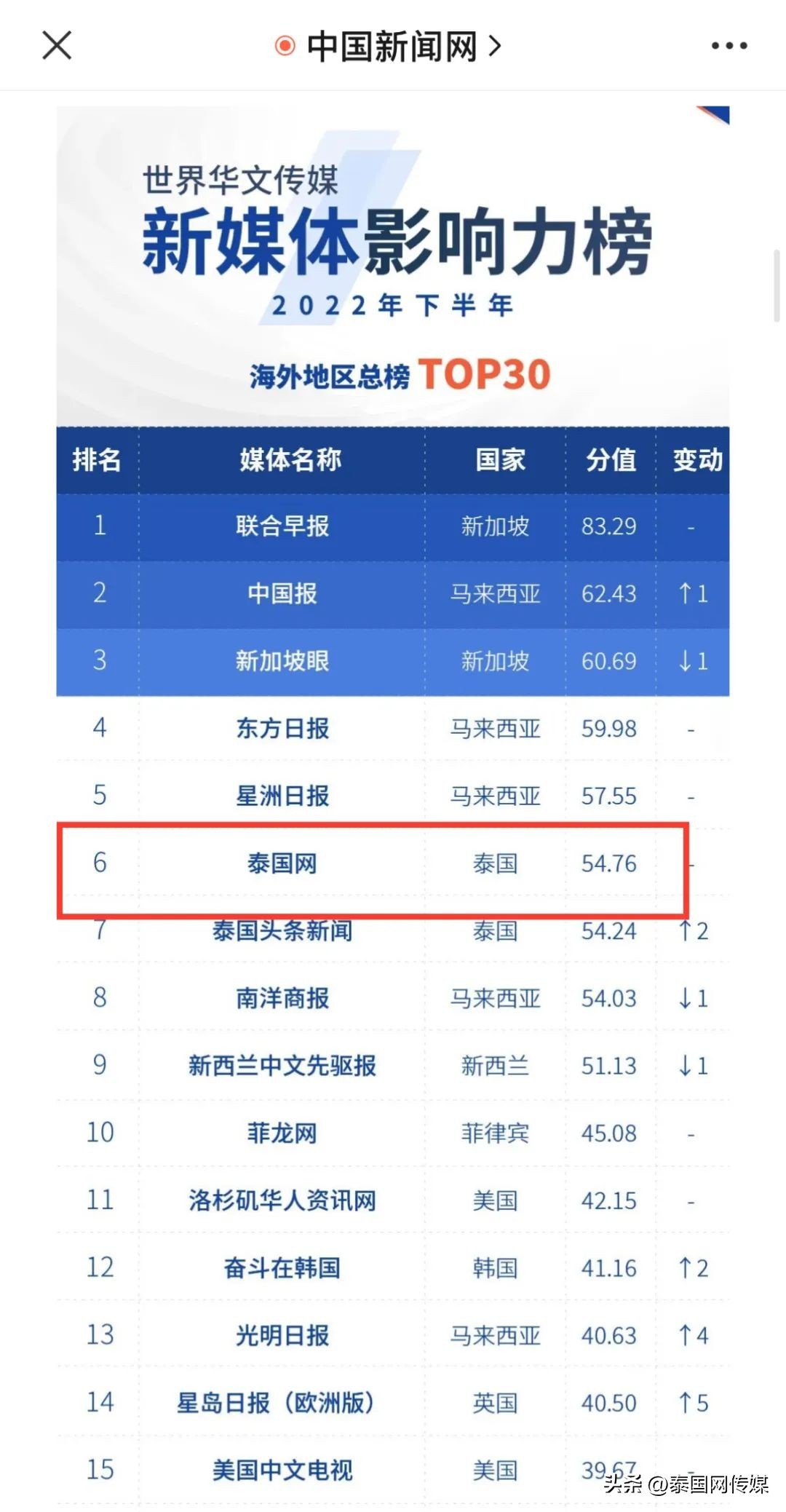 (原标题:泰国网!仍然是泰国第一华文媒体!2022年下半年世界华文传媒新媒体影响力榜出炉!)