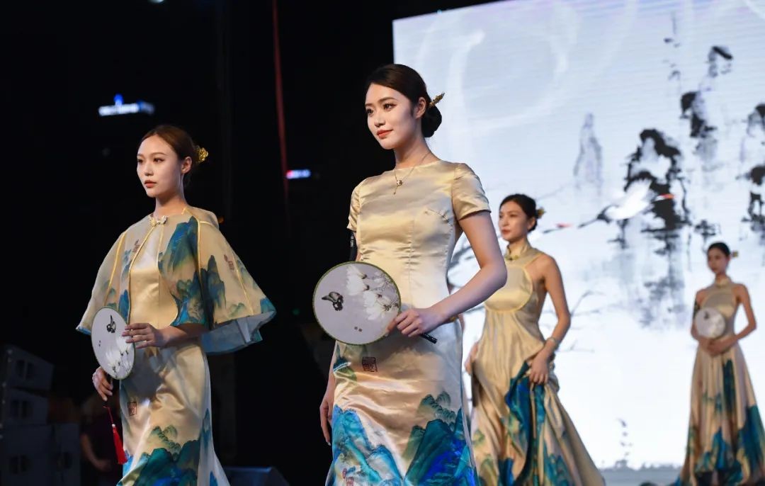 接着是《千里江山》主题,佳丽们身着华丽的服装,展现出行走的山水画卷的美感。设计精心的服装融合了中国传统元素和现代时尚,给人一种古典与时尚并存的视觉冲击。佳丽们优雅自信的步履中透露出对自然之美的敬畏,仿佛是置身于山水之间的隐士。