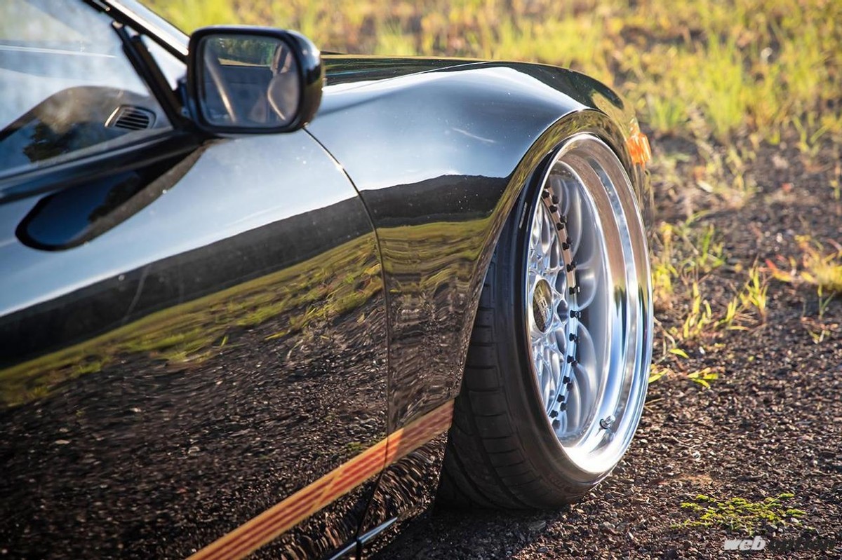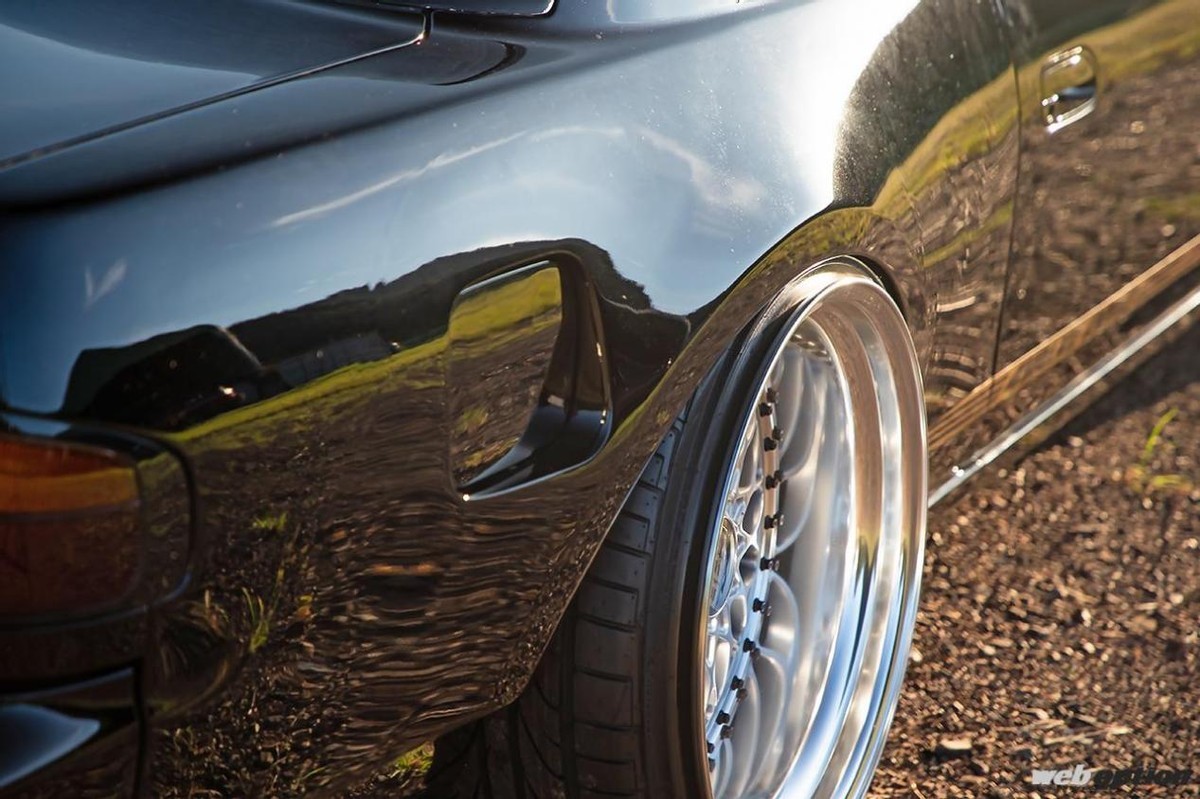 在Ishikawa 宽体的加持下,Silvia S13前部翼子板一侧加宽 20 mm,后部一侧加宽 40 mm,而这台Silvia S13车身与宽体的接缝处已经用腻子填充,形成自然的弯曲轮廓,同时让整个车身呈现出更为流畅的线条。