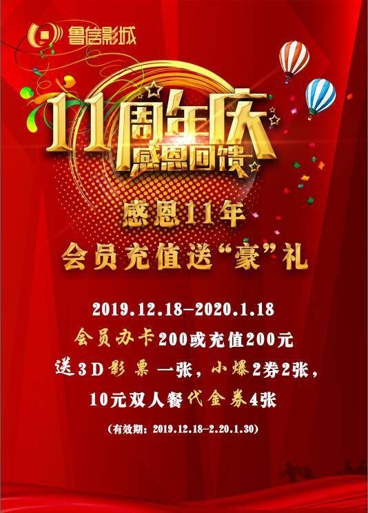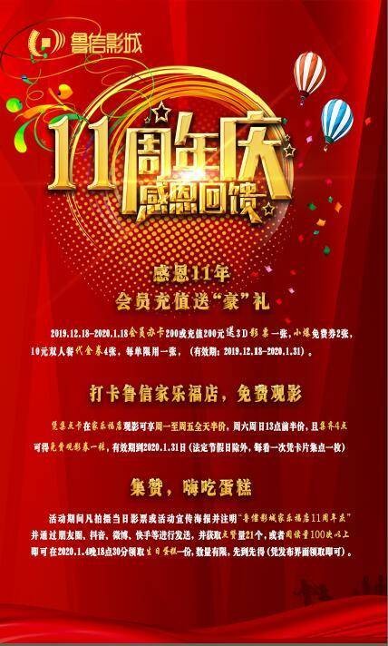 鲁信影城家乐福店自2009年1月4日成立以来已经过去10个年头,马上要迎来11岁生日了!为回馈广大新老影迷观众,鲁信影城特开展11周年庆活动,活动内容如下: 活动一:“感恩11年,会员送’豪‘礼”