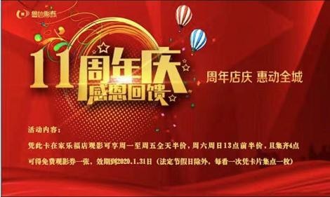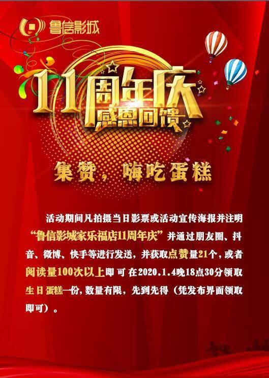 活动期间,凡现场顾客拍摄当日影票及活动宣传海报并注明“鲁信影城家乐福店11周年庆”等字样并通过朋友圈、抖音、快手等软件进行发送,活动点赞量21个(含)或阅读量在100次以上(含),即可在2020年1月4日晚18:30分领取生日蛋糕一份及半价观影券一张(凭发布界面到现场兑换即可)。数量有限,先到先得。 以上活动鲁信影城家乐福店享有最终解释权。