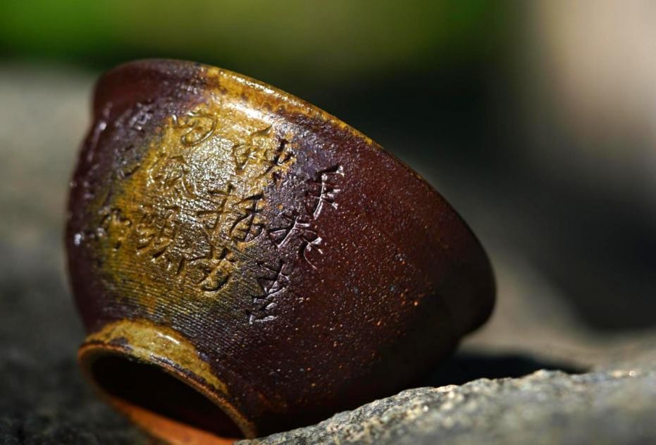 最后,看看延芫法师这只柴烧法雨盏上镌刻的《插秧诗》。