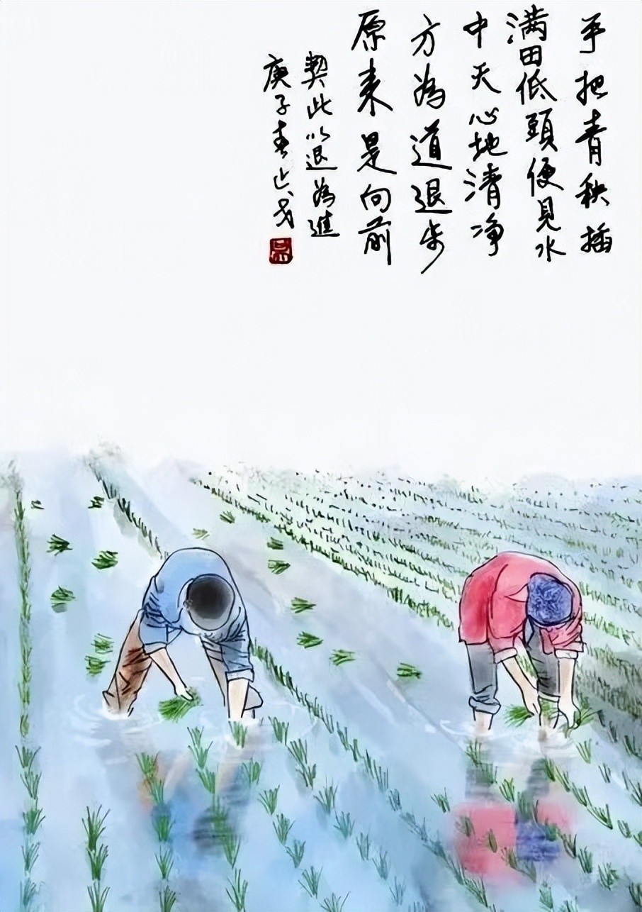 大江南北,年年春来,遍地插秧,再平常不过。可古往今来,又有几人能从这再平常不过、再频繁不过的插秧中读出悟道人生的哲理呢?低着头插秧,可以通过水的倒映看到天;倒退着插秧,等插好之后,才感悟到自己刚才的倒退,其实正是在向前进展。