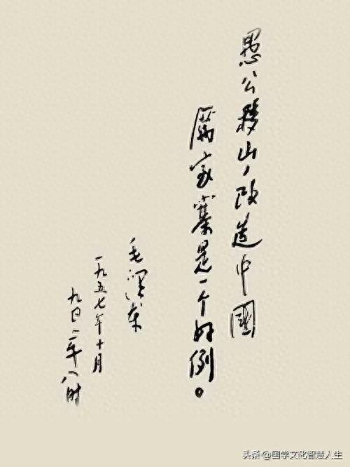 1945年6月11日,毛泽东主席在党的七大结束时发表题为《愚公移山》的演讲,向全党发出了“下定决心、不怕牺牲、排除万难、去争取胜利”的号召,愚公移山精神以其深厚的历史传承、丰富的思想精神内涵,在我们党领导人民推进革命、建设和改革开放的各个重要时期发挥了重要作用。1957年,毛泽东主席对《山东莒南县历家寨大山农业社千方百计争取丰富再丰收》一文写了批示:“愚公移山,改造中国,历家寨是一个好例。”极大的激发了翻身解放的中国人民投身伟大的社会主义建设的热情和斗志。“愚公移山精神”已经成为中华民族传统文化和精神谱系的重要组成部分。