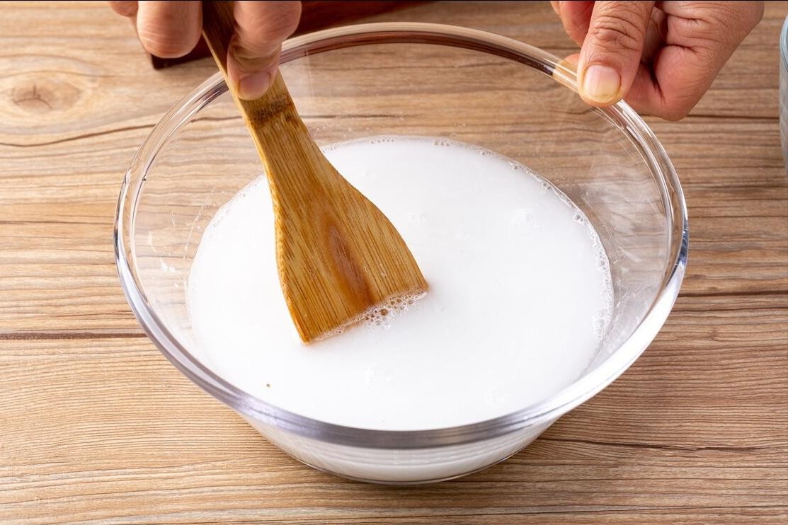 3、倒的时候,用勺子不停搅拌,直至所有的淀粉糊都倒进去之后,我们再继续搅动一段时间,直至里面的淀粉糊变得透明状为止。接下来准备一个容器,最好是长方体的,把面糊倒进去,待其冷却以后,放入冰箱内。