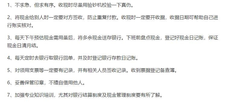 新出纳,刚到公司一定要多学多问,态度认真,经过一段时间锻炼,相信很快都能熟悉工作!下面七点是出纳必须要遵守的