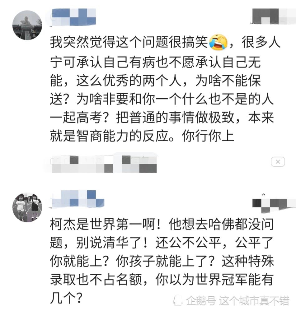 从以上网友的评论当中可以看出,大家对于柯洁的能力是比较认可的,对于这样的人才保送清华也是毋庸置疑的,毕竟人家有特长,所以保送清华是实至名归,但有些网友却并不这样认为,甚至提出了这样的质疑:“如果按照一般的清华毕业生要求,他能及格吗?”