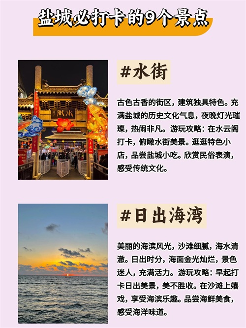 游玩攻略:在水云阁打卡,俯瞰水街美景。逛逛特色小店,品尝盐城小吃。欣赏民俗表演,感受传统文化。