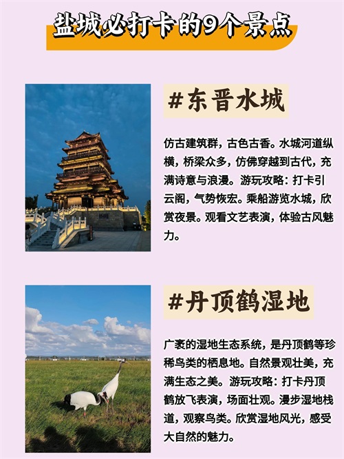 游玩攻略:打卡丹顶鹤放飞表演,场面壮观。漫步湿地栈道,观察鸟类。欣赏湿地风光,感受大自然的魅力。