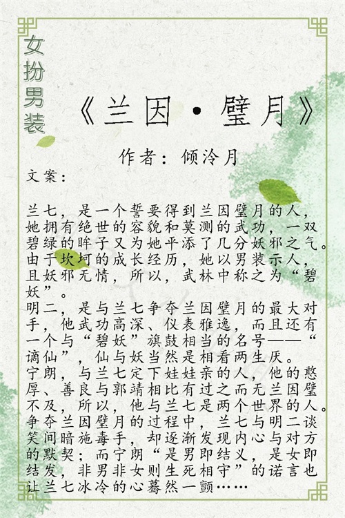 倾泠月的《兰因璧月》此文也是经典女扮男装文,男女主都是聪明腹黑,两个人从少年开始就处处针锋相对,到处给对方使绊子,两个人都欲夺得“兰因璧月”成为武林盟主,谁料半路杀出东溟岛,迫使两人联手,相处之下,两人日久生情~最后成为神仙眷侣,相伴江湖,无拘无束,潇洒自在,百看不厌,强烈推荐!