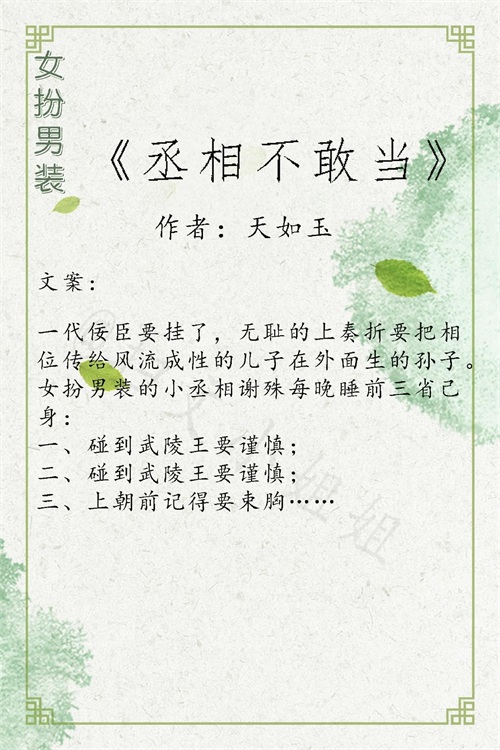 天如玉的《丞相不敢当》超级好看,文笔欢脱又轻快的古言,将沉重的权谋与朝廷写得妙趣横生,背景是魏晋南北朝。女主谢殊女扮男装入朝当了宰相,与男主卫屹之政场敌对,皇帝为了遏制谢家势力,将武陵王卫屹之调回都城。然而卫屹之表面看似和谢殊针锋相对,私底下却主动与她示好。二人从针锋相对到兄弟相称,来往密切,实际上虚情假意。女主和男主两人确定关系后依然是政敌,他们都没有改变自己,没有为对方妥协,结局是女主诈死保全自己的身份嫁给了男主。