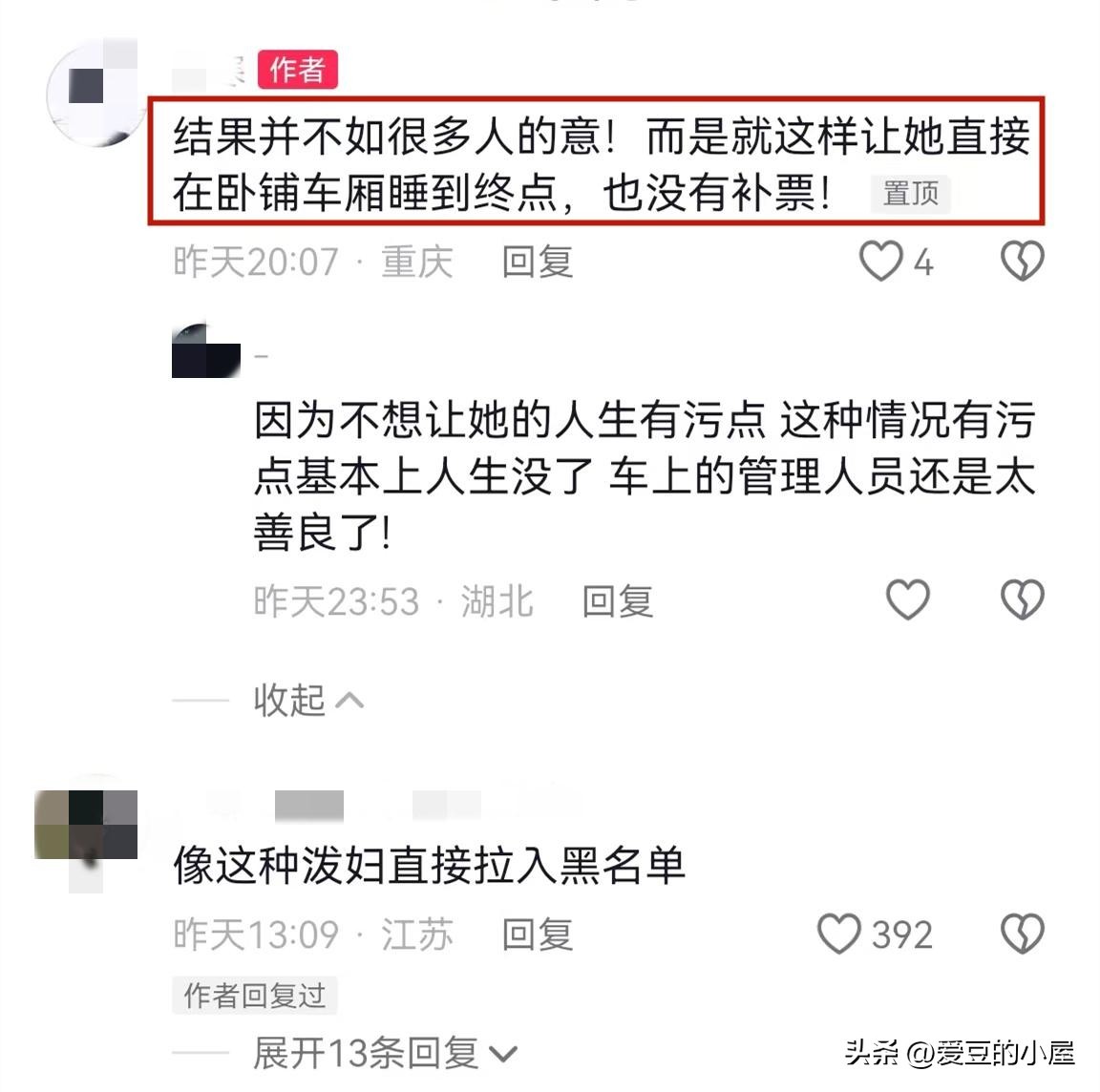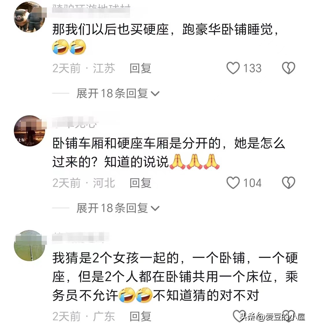 还有网友认为,卧铺与硬座车厢是分开的,如果不处理的话,大家纷纷效仿,几个朋友出门坐火车,就只买一个卧铺了。