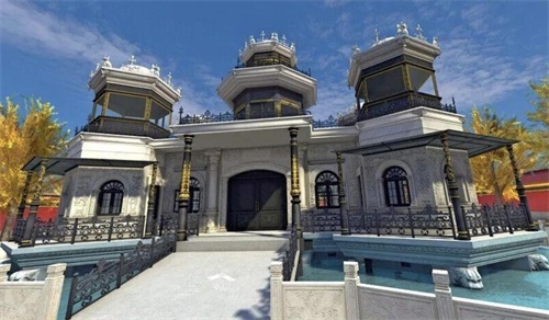 两层水上,每层9间,在宫殿四角各立一座三层六角亭,按照原设计,这座楼本是铜框架结构,施工时改成了花岗岩结构。