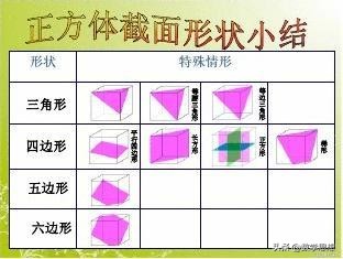 对立体图形的截面,各个版本小学教材均没有安排具体的课时。截面在小学阶段一般是指去切割一个几何体,得到的平面图形叫截面。这个截面可能是圆、椭圆,也可能是三角形、四边形、六边形或其他图形等。
