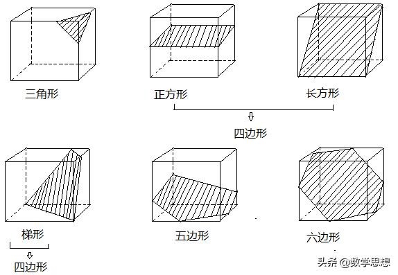 截一个正方体,截面可能是:三角形、正方形、长方形、梯形、五边形、六边形(如下图),不能截出七边形,因为正方体只有六个面。整个活动过程中,教师要参与其中,适时进行点拨与指导,及时给予鼓励。
