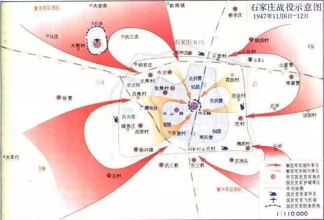 石家庄又称石门,位于石德(石家庄―德州)、平汉(今北京―汉口)、正太(正定―太原)三条铁路交会处,是华北战略要地。国民党军在原侵华日军构筑的工事基础上,经连年加修,至1947年已构成完备的环形防御体系。从市郊到市中心,以宽8米、深6米的外市沟和宽、深均5米的内市沟及市区主要建筑物为骨干,设置了三道防御阵地,共有大小碉堡6000多个。内外市沟间的环形铁路有6辆铁甲车,并配有1个坦克连,可机动作战。市东北有制高点云盘山作依托,西北有军用飞机场便于空中支援。1947年10月,驻守石家庄的国民党军为第3军第32师及2个保安团和附近19个县的保安大队,处境孤立。11月初,保定"绥靖"公署将其独立团和驻保定的第3军炮兵营空运石家庄,使石家庄守军总兵力增至2.4万余人。10月22日,清风店战役结束的当天,晋察冀军区司令员兼政治委员聂荣臻等即向中共中央军委提出迅速集中野战军3个纵队和6个独立旅乘胜夺取石家庄的建议。经中央军委批准后即抓紧进行战役准备。25日,人民解放军总司令朱德出席晋察冀野战军的作战会议,提出"勇敢加技术"的号召,并与野战军司令员杨得志、第一政治委员罗瑞卿、第二政治委员杨成武等研究制定了作战计划,确定"以阵地战的进攻战术为主要方法",采取稳打稳进的方针;以坑道作业接近碉堡,用炸药爆破,辅以炮击,各个摧毁守军工事;继以步兵突击,夺取守军各道阵地。其部署是:第3、第4纵队分别由西南和东北方向担任主攻;冀晋、冀中军区部队各一部分别由西北和东南方向助攻;第2纵队、独立第9旅及第3、第9军分区部队配置于定县(今定州)、新乐间,构筑防御阵地准备阻击保定方向的援敌;察哈尔(今分属内蒙古、河北)军区独立第4旅出击北平(今北京)至保定铁路沿线,配合主力作战。同时,将清风店战役中俘虏的近千名国民党军官兵经教育后释放回石家庄,以瓦解守军士气。晋察冀解放区政府调集民兵、民工近10万人,担架1万多副,大车4000余辆支援作战。11月5日夜,攻城部队南渡滹沱河,突然包围石家庄外围各据点。6日拂晓全线发起攻击,当日攻克一些村镇。7日晨,冀晋军区独立第1、第2旅分别向石家庄东北、西北两面出击,一举攻克大郭村飞机场,歼守军1个营。8日晨,第4纵队连续突击,攻克云盘山。至此,全部扫清了外市沟以外守军据点。同时,野战军炮兵击中发电厂,断绝了市区及内、外市沟电网的电源。各部队在火力掩护下进行近迫作业,构筑交通壕,直插外市沟前沿。8日下午,炮兵部队实施火力急袭,突击部队以坑道爆破和强行突破的方法,向守军外市沟防御阵地发起攻击。第3纵队第7旅首先从西兵营突破,攻克西焦、城角村和农业试验所,歼守军一部,击毁铁甲车1列;第3纵队第8旅突破外市沟阵地后,攻占振头镇、西里村;第4纵队第10旅由云盘山以西突破,攻占义堂村、花园村及八里庄,歼保定"绥靖"公署独立团主力;第4纵队第12旅在北宋附近突破,攻占范谈村;冀中军区独立第7、第8旅攻占东三教、槐底村;冀中军区独立第1、第2旅包围北焦等据点。战至9日晨,内、外市沟之间守军阵地,除北焦、苑村、元村、彭村等据点外,全部被攻克。攻城部队随即以一部兵力围困、监视上述据点,主力继续向内市沟守军阵地推进。10日16时,攻城部队在强大炮火配合下,向内市沟防御阵地发起攻击。第8旅率先爆破成功,从西面突破,经反复争夺,攻占西南兵营、东里村,歼守军第96团主力。第10旅从东面突破后,连续打退守军第94团在坦克掩护下的7次反扑,巩固了突破口,并迅速向铁路以东市区发展。冀中、冀晋军区部队歼元村、彭村、北焦守军。10日、11日,担任第二梯队的第4纵队第11旅、第3纵队第9旅相继加入战斗。各部队勇猛穿插,分割围歼,经过激烈巷战,歼灭守军大部,并将守军残部压缩于火车站、大石桥和正太饭店一带核心阵地内。12日晨,晋察冀野战军调整部署。第11旅炸毁铁甲列车后,并在缴获的坦克、火炮掩护下向守军核心阵地发起冲击,攻占火车站和正太饭店。接着,第3纵队主力从西面和南面,第4纵队从东面和北面,冀晋军区部队从西北面,向守军指挥中心大石桥发起攻击,激战至中午全歼守军,俘第3军第32师师长兼石家庄警备司令刘英。12月3日,冀中军区部队乘胜攻克石家庄外围孤立据点元氏县城,全歼守军4000余人。