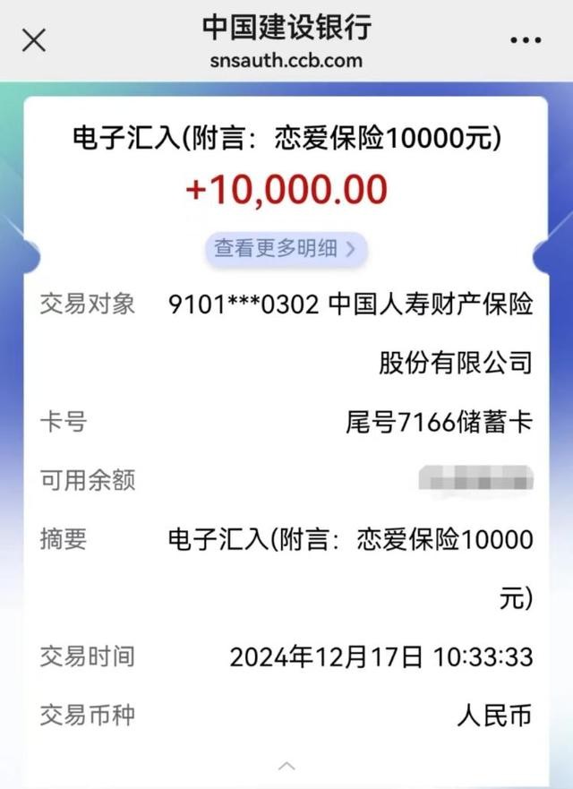 广东的齐先生告诉记者,2015年底,他在微信上花199元购买了中国人寿推出的“恋爱保险”,“可以选择1万朵玫瑰或1万元,但早几年我们已经提前办完了婚宴。今年底刚好9年,就选择了要钱。打了人寿的电话,提供了结婚证、身份证和两份表,还提交了结婚视频,审核通过了在10个工作日内就到账了。算是30岁前最稳的一笔投资,两个人的爱情,50倍的回报。”转账截图显示“电子汇入10000元(附言:恋爱保险10000元)”,日期为2024年12月17日。