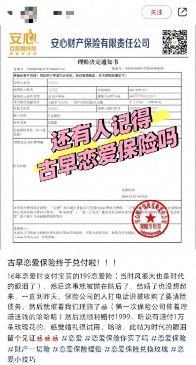 有网友发帖称,多年前购买的“恋爱保险”顺利赔付了。网络图