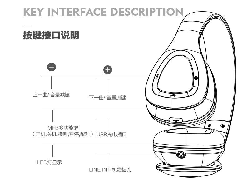 魔鬼猫蓝牙耳机右侧机身共有三个按键(下左右),下键为多功能按键,用于开机、关机、接听电话和配对等;右键为 + 功能键,短按下一曲,长按增加音量;左键为 - 功能键,短按上一曲,长按减小音量。