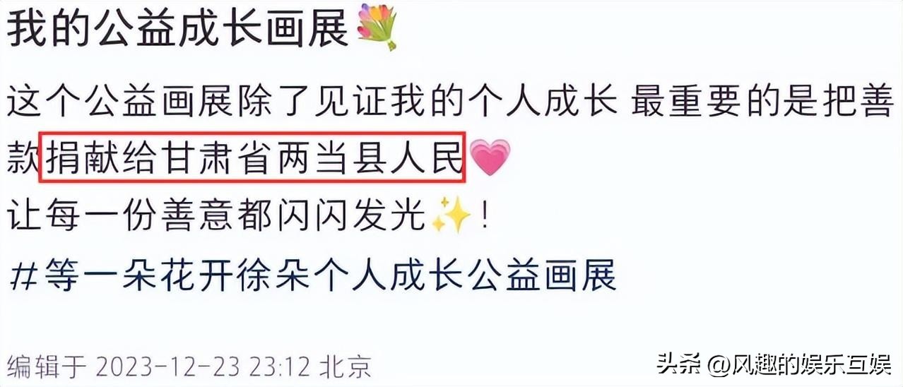 ”原来,她在北京举办了一场个人画展,她将画作义卖后的所有善款,都捐献给了甘肃省两当县的人民。