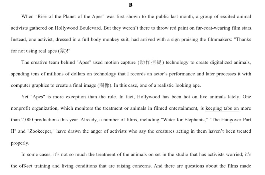 大意就是在大洋彼岸的电影《猩球崛起》因为使用电脑合成技术而代替了使用动物演员避免对动物造成伤害而受到动物保护组织的赞赏,感谢。