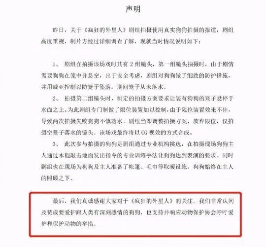 在同一个电影领域中,如《疯狂的外星人》剧组因使用狗狗落水镜头还特别声明表示对动物的保护与爱护。