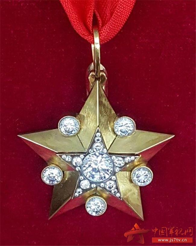 与西方国家向元帅授予权杖的习惯不同,苏联元帅授予“元帅星”证章。此章章体是一枚同心五角星证章,大五角星内同心套装一个白金制作的小五角星,在小五角星中心处嵌有25枚钻石,在大五角星角间也镶嵌了5颗钻石。并用丝质绶带挂在颈项上。