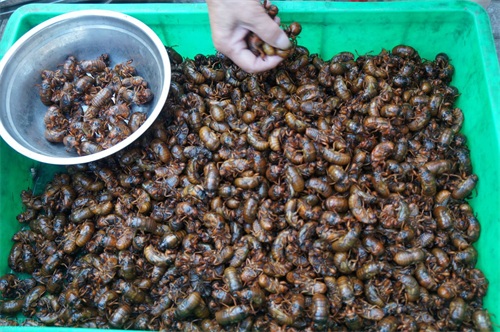 而不管是知了猴还是金蝉,都可以食用,不过知了猴的食用价值最高,口感最好,且营养成分丰富,在市场上也深受欢迎。如今已是6月下旬,知了猴新鲜出炉,吸引了不少人购买食用。