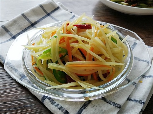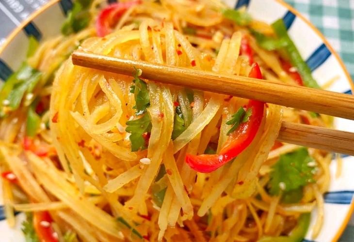 - 即可享用酸辣脆爽的凉拌土豆丝。
