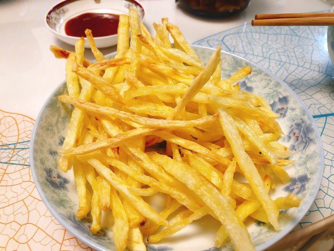 - 加热油至6成热,将土豆条炸至金黄酥脆,捞出沥油。