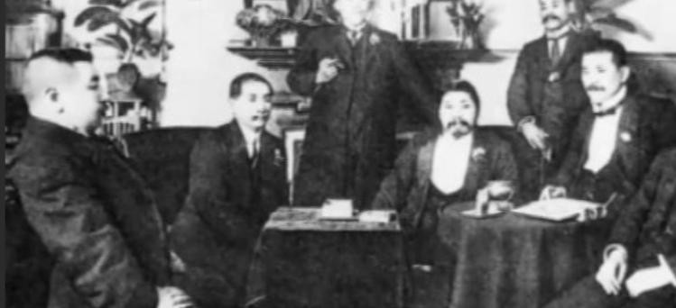 华兴会长沙武装起义事泄未果。是年冬部分会员流亡东京,留影纪念。左起前排一黄兴