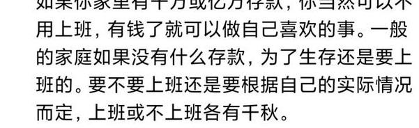 因此,我认为,不上班不工作的生活并不是适合所有人的生活方式,需要根据个人的实际情况和追求来做出选择。无论选择上班还是不上班,我们都应该尊重他人的选择,追求自己所向往的生活。