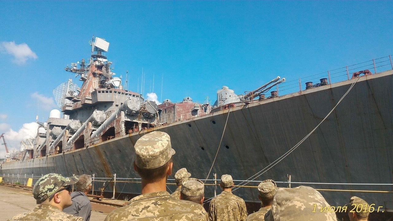 “乌克兰”号是“光荣”级巡洋舰的四号舰,原名“共青团员”号,排水量11490吨,是苏联时期建造的第二大导弹巡洋舰,仅次于“基洛夫”级核动力巡洋舰。“乌克兰”号自1990年8月11日下水之后,一直以完工90%的状态,停在它的出生地黑海尼古拉耶夫造船厂,苏联解体之后,被乌克兰继承,经过造船厂一段时间地敲敲打打,完工进度升级到96%之后,就再也没有动静了。
