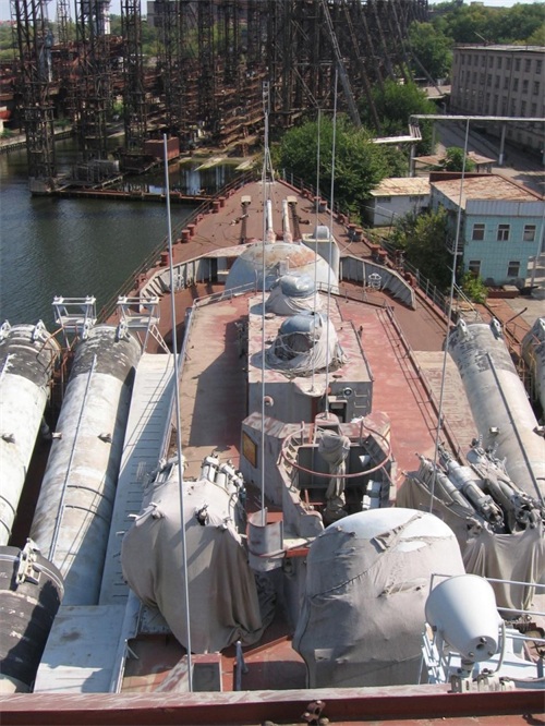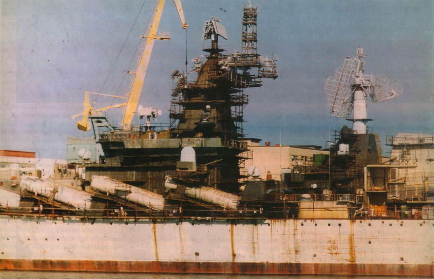 也正是从这个时候开始,“乌克兰”号被拖到原先造航母的船坞中,开始了对雷达、火炮的拆解。万幸的是由于资金不足,已经宣布倒闭的黑海造船厂连拆它都拆不起,所以只好停在那里,等待未知的命运,最终反而被保存下来了。