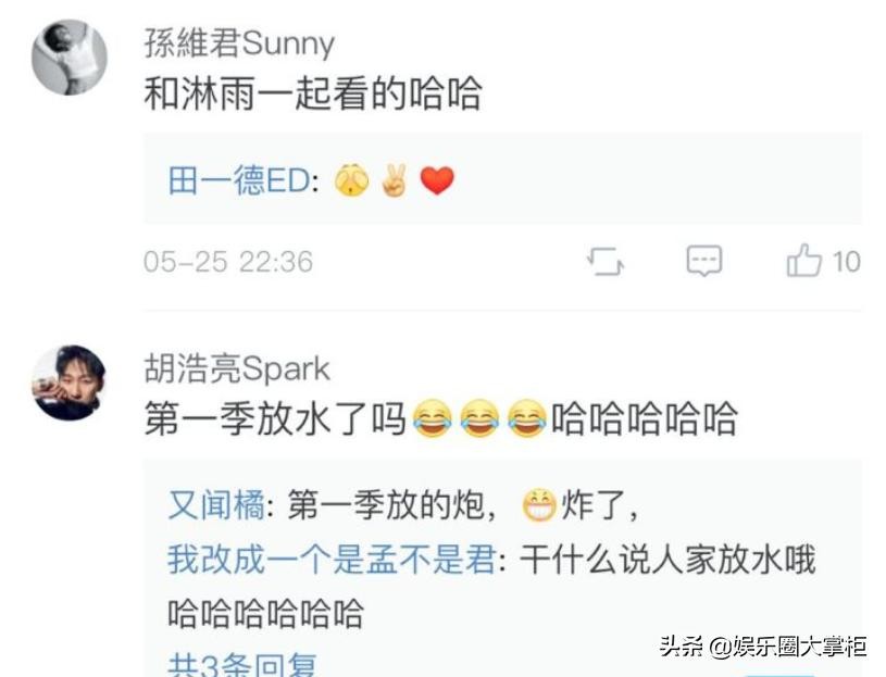 转过年到了2019年的时候,又发生了一件迷之操作,胡浩亮在田一德老师微博底下留言:第一季放水了吗?