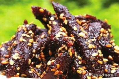 汪洋干巴牛肉:汪洋镇的名特产,始创于清代乾隆年间,是清代宫廷贡品。选取优质鲜牛肉,经腌烤炒等多道工序制作,油润泛红,条粒成型,食香化渣,麻辣爽口,南北风味、老少适宜,具有芬香浓郁,纯正淳厚,余味悠长的独特风格,入选眉山市非物质文化遗产名录,是四川省名优特色产品。