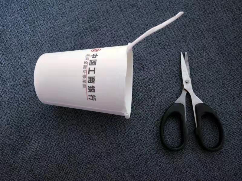2、然后使用剪刀把纸杯的杯口边剪掉,注意小心使用剪刀,有必要时,请家长协助。