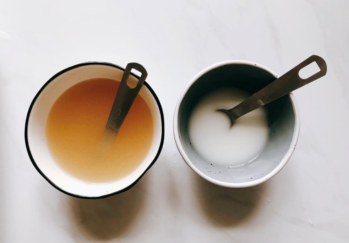 ② 取一个小碗,加入泡香菇和海米的水,如果重量不足补充至150g,再加入[调味料]里的盐、糖、鸡粉拌匀。